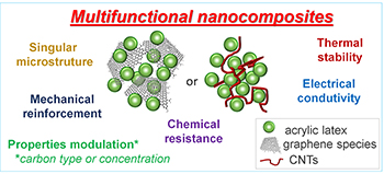 Multifunctional nanocomposites between carbon nanostructures and acrylic latex were successfully prepared, with improved and tunable properties compared to the neat polymer.