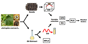 Determination of phorbol esters of Jatropha curcas L. using NIR and UV spectroscopies employing PLS regression and variable selection.