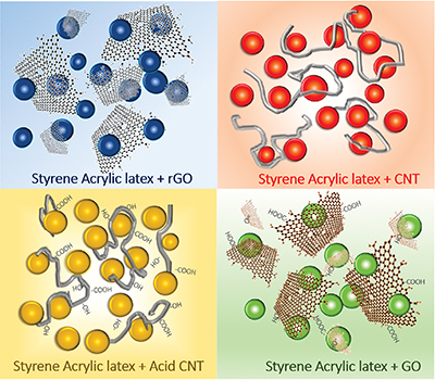 Acrylic latex-based nanocomposites have been prepared with three different carbon nanomaterials (nanotubes and graphene-like structures). Due to the unique interaction between the components, resulting materials present noticeable multifunctionality. The electrical, mechanical, magnetic and chemical properties can be modulated according the type and amount of filler, creating several different materials that can be chosen for specific applications. Details are presented in the Article Multifunctional Nanocomposites between Different Carbon Nanostructures and Styrene Acrylic Latex by Carolina F. Matos, Fernando Galembeck and Aldo J. G. Zarbin on page 1396.