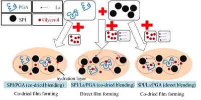 Higher water retention ability and a single glass transition temperature (Tg) were found in ternary co-dried blending films when propylene glycol alginate (PGA) was added by a co-drying process. A single Tg indicates the compatibility of soy protein isolate (SPI), PGA and lauric acid (La). Differential scanning calorimetry scans showed higher relative humidity (RH) and reduced Tg due to incorporation of La.