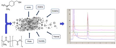 This study presents degradation studies, development and validation of an analytical method applied for both determination of perillyl alcohol encapsulation efficiency and evaluating the presence of related degradation products in polymeric nanoparticles formulation.