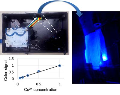 A low-cost video-based reflectometer device was developed to quantify Cu2+ using paper-based colorimetric sensors.