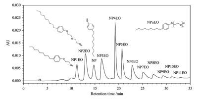 Under the optimized high performance liquid chromatography (HPLC) conditions, the NP and 11 kinds of NPnEO were separated and determined successfully within 35 min.