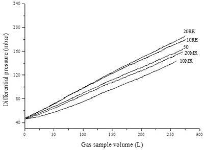 Pressure differential in the filter element resulting from the retention of particulate matter (PM) as a function of the volume of sampled gas to diesel CN 50 and your formulation with 10MR, 20MR, 10ER and 20ER. Lower differential pressure according to the gas volume indicates lower retention of PM.
