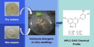 Chemical profile by HPLC-DAD of leaves extracts from V. divergens seedlings inoculated with endophytic fungi isolated from V. divergens roots on dry and wet seasons in the Pantanal.