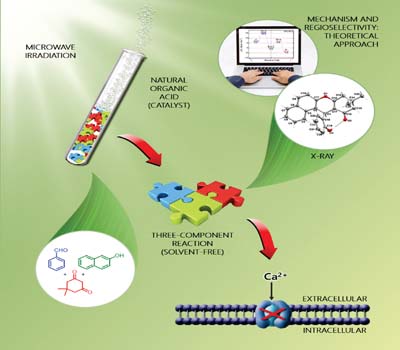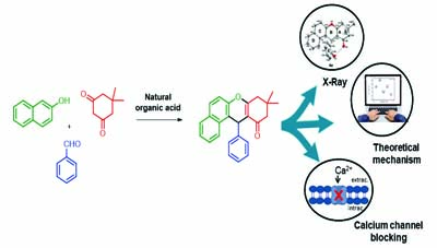 Natural organic acids (NOAs) were efficient as green catalysts for the eco-friendly synthesis of xanthenones (up to 93% of yield) via one-pot reaction and under solvent-free conditions. Theoretical calculations to evaluate this reaction mechanism and regioselectivity as well as the potential anti-calcium blockers properties of xanthenones were described for the first time. Details are presented in the Article Natural Organic Acid as Green Catalyst for Xanthenones Synthesis: Methodology, Mechanism and Calcium Channel Blocking Activity by Bruna S. Terra, Aura M. B. Osorio, Aline de Oliveira, Rebeca P. M. Santos, Andressa P. Mouro, Natália F. de Araújo, Cameron C. da Silva, Felipe T. Martins, Luciene B. Vieira, Daniella Bonaventura, Heitor A. de Abreu, Antonio F. C. Alcântara and Angelo de Fátima on page 2313.