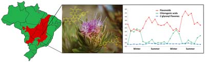 The spatial and temporal variations in the secondary metabolites from Lychnophora ericoides were investigated. Chlorogenic acids presented highest concentrations in the dry season, while flavonoids were higher in the rainy season. Lower concentrations were found for all metabolites in flowery branches and old leaves.