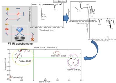Infrared spectroscopy coupled with principal component analysis allowed discriminating the fractions and identifying the functional groups of compounds present in the sample.
