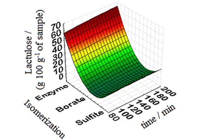 Response surface for the concentration of lactulose according to the type of isomerization and reaction time.