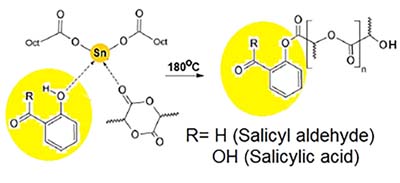 Ring opening polymerization initiated by tin(II) 2-ethylhexanoate was used to introduce salicyl aldehyde and salicylic acid end groups in poly(lactic acid).