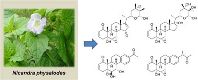 Five new withanolides, in addition to six others previously reported, were isolated and characterized from the leaf acetone extract of Nicandra physalodes.