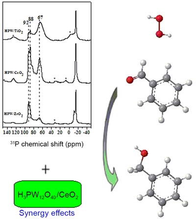 Phosphotungstic acid supported ceria shows excellent catalytic activity for oxidation of benzyl alcohol to benzaldehyde due to Bronsted-Lewis acid synergy effect.