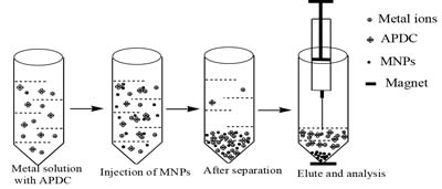 Nonanoic acid-coated magnetic Fe3O4 nanoparticles were used as adsorbents for preconcentration and separation of Cu and Pb. Methanol-nitric acid was used as eluent for desorption of Cu and Pb, finally detected by flame atomic absorption spectrometry.