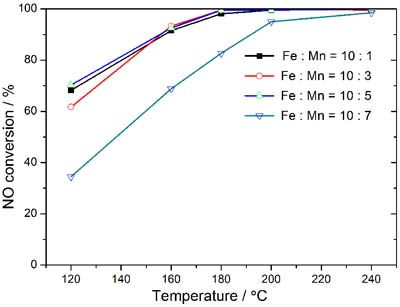 Catalytic activity profiles of 10FexMn/AC (x = 1, 3, 5) catalysts with different Fe and Mn molar ratios.