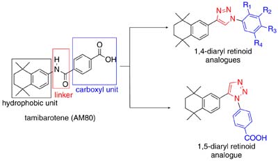 In this work, twelve novel 1,2,3-triazole retinoids analogues of tamibarotene (AM80) were synthesized, and biological activity was evaluated against human cancer cells.