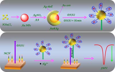 Based on thymine-Hg2+-thymine binding mode (T-Hg2+-T), a sensitive aptamer biosensor was constructed by utilizing functionalized Au@Ag core-shell nanoparticles as labels for detection of Hg2+.