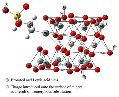 Schematic model of a 2:1 layer structure of the organofunctionalized materials present in this work, suggesting the superficial acid sites created.
