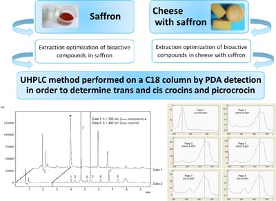Cheeses made with saffron are expected to provide an added value for consumers, due to saffron bioactive compounds. This UHPLC method seems to be useful to detect saffron crocins in dairy products.
