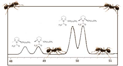 Chiral GC chromatogram of the peak discrimination of 2-methyl-6-undecylpiperidine trifluoroacetamide stereoisomers (synthetic standard mixture).