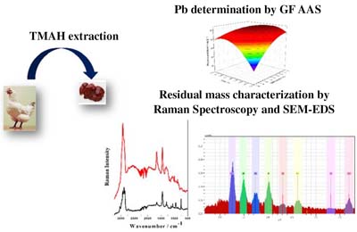 Lead content was evaluated in chicken viscera by GF AAS after solubilization with tetramethylammonium hydroxide (TMAH). Sample preparation was monitored by Raman spectroscopy and SEM-EDS.