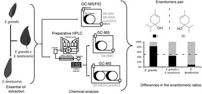 Fractionation of essential oils from Eucalyptus grandis x E. tereticornis, and its parental taxa, by HPLC followed by GC-MS analysis using two columns in series, allowed to determinate the enantiomeric excesses of selected monoterpenes. Significant differences were found in the enantiomeric ratios in monoterpene alcohols between the three essential oils.