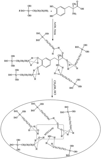 Surface of the activated silica gel was grafted with the complex of MTD-APS. The custom made holes to the MTD remain on the surface of molecularly imprinted adsorbent.