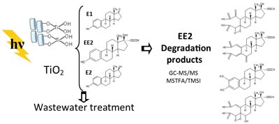Photocatalytic degradation of estrogens by suspended and immobilized TiO2 were compared in aqueous and wastewater samples. The EE2 degradation products were monitored by GC-MS/MS.
