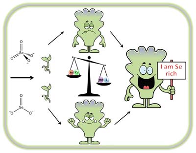 Selenate and selenite enrichment in the Veneza Roxa lettuce was carried out and the mineral composition was evaluated using ICP OES, PCA and molecular modeling. Selenate-biofortified lettuce showed a synergetic effect with S and Mo while selenite-biofortified lettuce showed a synergetic effect with Mn, P, Mg and Ca.