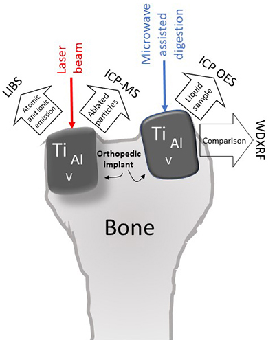 Laser-based analytical techniques for direct qualitative evaluation of orthopedic Ti alloys, and results comparison with data obtained after microwave-assisted digestion and inductively coupled plasma optical emission (ICP OES) determination.