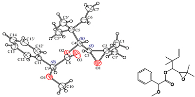 The absolute stereochemistry of clemateol was established on the basis of detailed NMR spectroscopic evidence (3JH-H analysis, derivatization as Mosher's esters and NOESY) and also by resonance scattering effects in the single crystal X-ray diffraction experiment of its (R)-mandelic acid ester derivative.