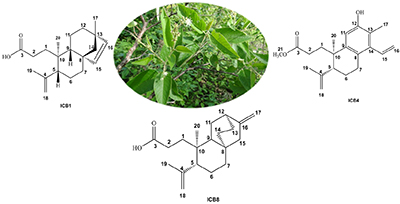 Three antibacterial 3,4-seco-diterpenes were isolated from hexane extracts of roots of individual specimens of Croton blanchetianus Baill.