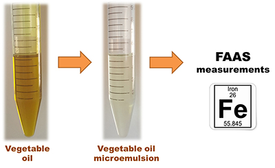 A fast and simple analytical method was firstly proposed for the determination of iron (Fe) in crude and refined vegetable oil samples by employing the conventional flame atomic absorption spectrometry (FAAS) technique and microemulsification as sample preparation procedure.