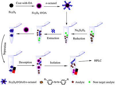 As shown in the figure, n-octanol, which was used as the extractant, and hydrophobic oleic acid modified Fe3O4 nanoparticles (Fe3O4@OA NPs), as an efficient adsorbent, were applied to retrieve the primary aromatic amines (PAAs)-containing n-octanol in the dispersive liquid-liquid microextraction (DLLME) step.