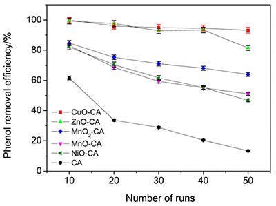 For metal oxides doped carbon aerogel (CA), the n-type and p-type semiconductors exhibited different electrocatalytic effect for phenol removal, and the former has higher effect.