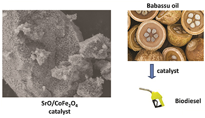 A very efficient SrO-based magnetic heterogeneous catalyst was developed in the studies presented herein. Biodiesel was produced from babassu oil transesterification with high yields in four catalytic cycles.