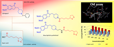 Two hybrids containing the indanone-piperidine moiety of donepezil and lipoic acid scaffolds were synthesized. One hybrid displayed moderate inhibitory activity against hAChE and greater activity against hBuChE. It also showed a good antioxidant activity, exhibiting better ability in scavenging 2,2-diphenyl-1 picrylhydrazyl (DPPH) radicals than lipoic acid.