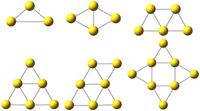 DKH2-B3PW91/DZP+1d-DKH optimized ground state electronic structures for the gold clusters, Aun (n = 3-8).