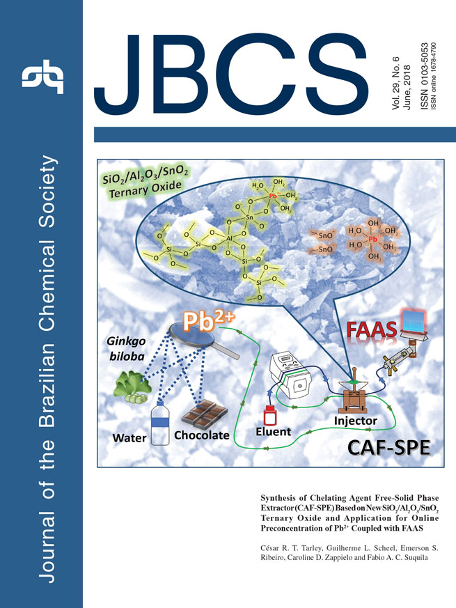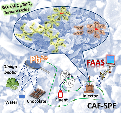 A SiO2/Al2O3/SnO2 ternary oxide was used as chelating agent free-solid phase extractor (CAF-SPE) in online solid-phase preconcentration system coupled to flame atomic absorption spectrometry (FAAS) for Pb2+ determination in different kind of water, chocolate powder and Ginkgo biloba samples. Based on the results, the material can be considered an efficient alternative as a silica-based adsorbent to be utilized for preconcentration and determination of Pb2+ at trace levels. Details are presented in the Article Synthesis of Chelating Agent Free-Solid Phase Extractor (CAF-SPE) Based on New SiO2/Al2O3/SnO2 Ternary Oxide and Application for Online Preconcentration of Pb2+ Coupled with FAAS by César R. T. Tarley, Guilherme L. Scheel, Emerson S. Ribeiro, Caroline D. Zappielo and Fabio A. C. Suquila on page 1225.