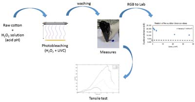 Scheme of the proposed UV mediated cotton bleaching process with H2O2, evaluated by colorimetry and tensile test.