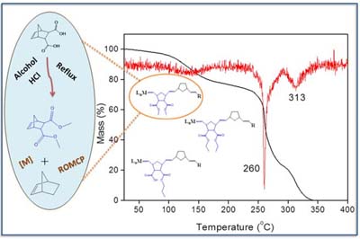 Copolymerization via ring-opening metathesis polymerization (ROMP) under air atmosphere of norbornene (NBE) and its ester-dicarboxylic derivate with Ru-catalyst.