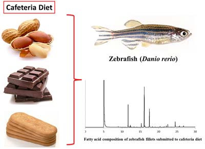 The effect of a cafeteria diet (chocolate, peanut and biscuit) on the composition of fatty acids in zebrafish fillets was evaluated by gas chromatography.