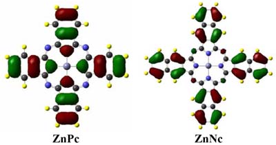 Computational calculations (density-functional theory, DFT) of Q-band involved molecular orbitals in phthalocyanines and naphthalocyanines with similar structures.