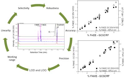 Quantification of fatty acid methyl or ethyl esters obtained from soybean oil and comparison of analytical methodologies applied to biodiesel samples.