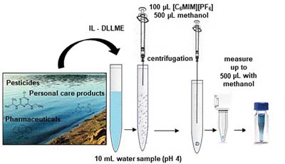 Ionic liquid-dispersive liquid-liquid microextraction (IL-DLLME) was successfully used for the extraction of the pesticides and pharmaceuticals and personal care products (PPCPs) in water.