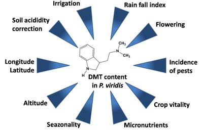 Environmental parameters, nutrients, plant characteristics, data on farming methods were correlated with N,N-dimethyltryptamine, determined by gas chromatography coupled to mass spectrometry (GC-MS).