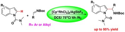 A rhodium-catalyzed alkylation reaction of indoles with N-Boc-imines has been developed via C−H activation to afford a series of biological important 2-indolylmethanamine derivatives with good functional group tolerance and high yields.