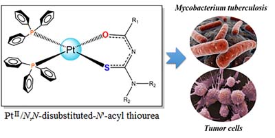 Twelve [Pt(PPh3)2(acylthiourea)]PF6 complexes was synthesized and evaluated against Mycobacterium tuberculosis and human tumor cells.
