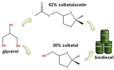 Glycerol was reacted first with acetic acid to synthesize monoacetin. Then monoacetin and residual glycerol were reacted with acetone to obtain 62% solketalacetin, 30% solketal, and 8% diacetin.