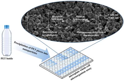 We proposed a fast, low-cost, microscale fluorescence-based screening methodology for PET degrading microorganisms with selective detection of the terephthalic acid monomer produced during the microbial hydrolysis.