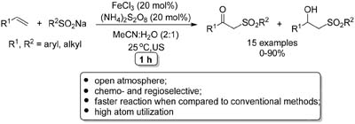 The ultrasound-assisted oxysulfonylation of alkenes using sodium salts of organosulfinic acids under air atmosphere in a chemo- and regioselective way is described. The β-keto-sulfones were obtained in good yields as major products.